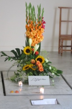 Wenn man die Kapelle dann betritt, fällt der Blick sofort auf das Grab des Seligen. Es ist immer mit Blumen geschmückt. Jetzt zum Fest sind sie natürlich besonders prächtig und von einer unserer Schwestern gestaltet. Aber auch sonst ist es nie ohne Blumen, denn immer wieder kommen