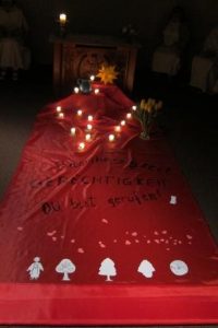 Richtig Farbe in die Buchstabenwüste bringt auch immer wieder die Liturgie: unser roter Teppich in der Kapelle wird weiter und weiter ausgerollt. Gestern kam die